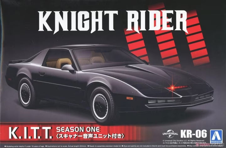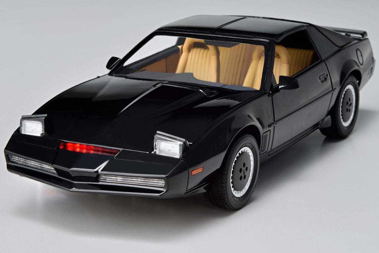 Aoshima's model kit of the iconic Knight 2000 K.I.T.T. car from "Knight Rider" is now equipped with a voice unit and scanner! A new scanner unit is mounted to the vehicle, which is the initial version of the "Knight Rider" Season 1 specifications. Eight LEDs are used to realistically reproduce the impressive scanner mounted on K.I.T.T.'s front bumper; a voice playback gimmick is included with the voice of Akio Nojima, who provided K.I.T.T.'s voice in the Japanese-dub version of the show. It includes six fog lamps with louvers, an instrument panel with two monitors, and the Season 1 version of the roof console with a removable window. The scanner and voice are operated with an external switch; four bits of dialogue plus the scanner sound effect are included. Order yours today!