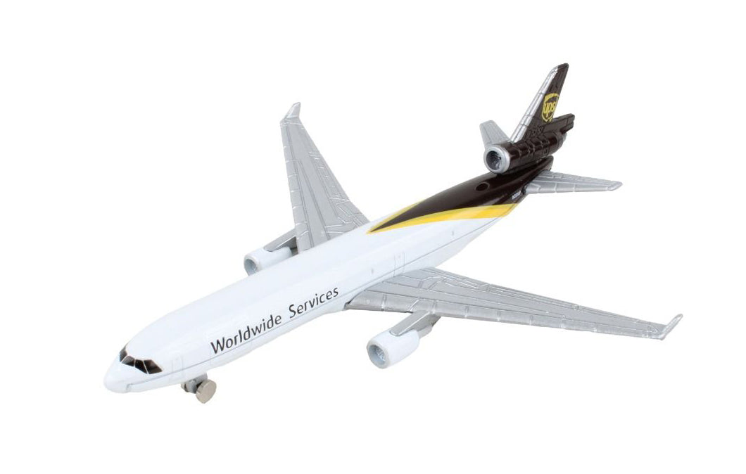 This authentic die cast MD-11 sports the UPS logo on its tail. It is made of die cast metal.