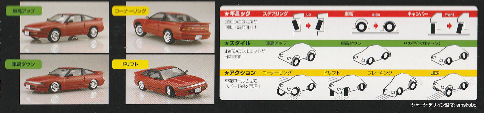 The suspension structure of the chassis has been newly designed with all-new mold parts. Thanks to the steering and alignment gimmick, various styling setups are possible. With the four-wheel independently adjustable height system and the four-wheel independently adjustable camber system, you can freely customize the style, whether it's standard height, lowered, or racer-style with cambered wheels.