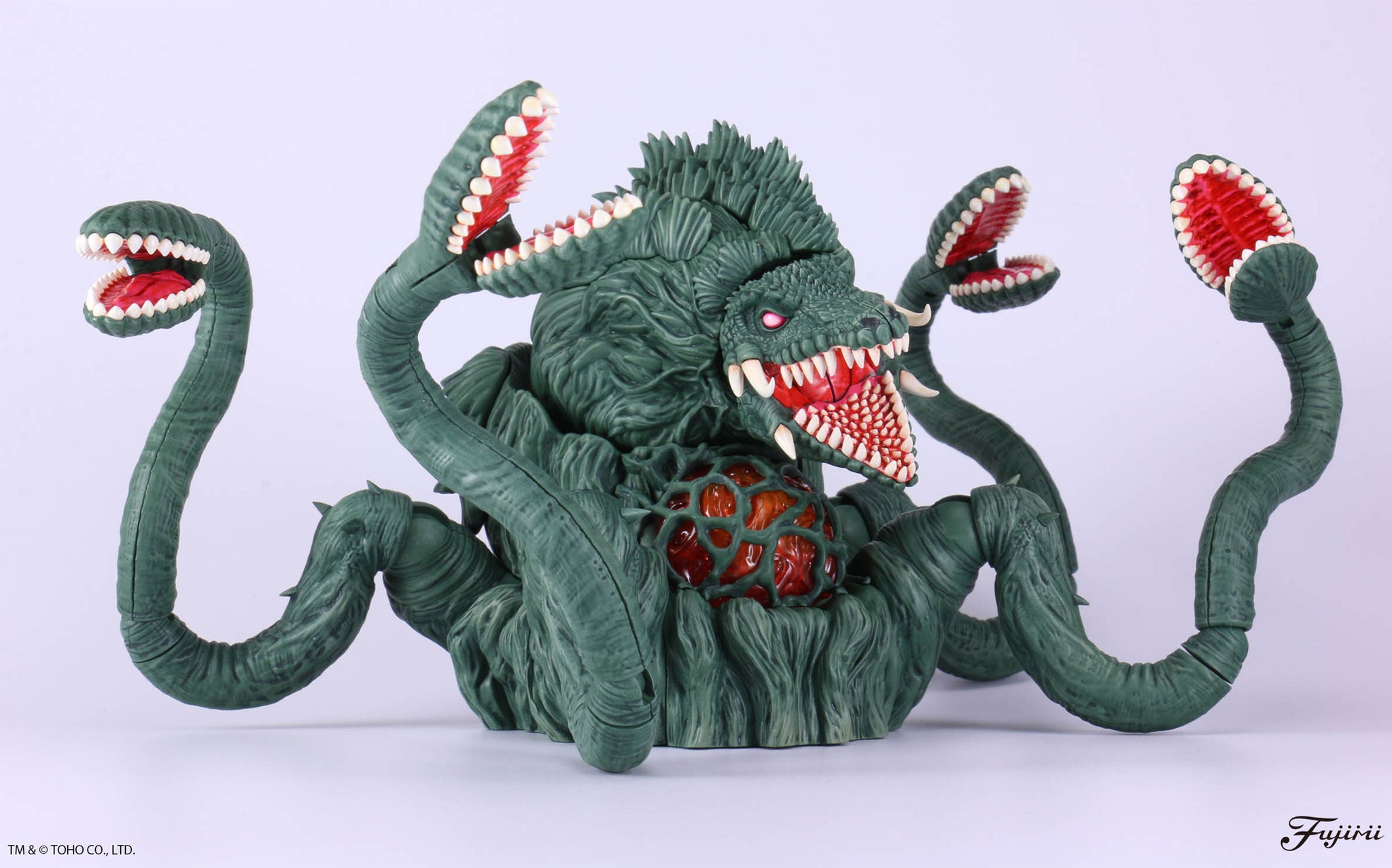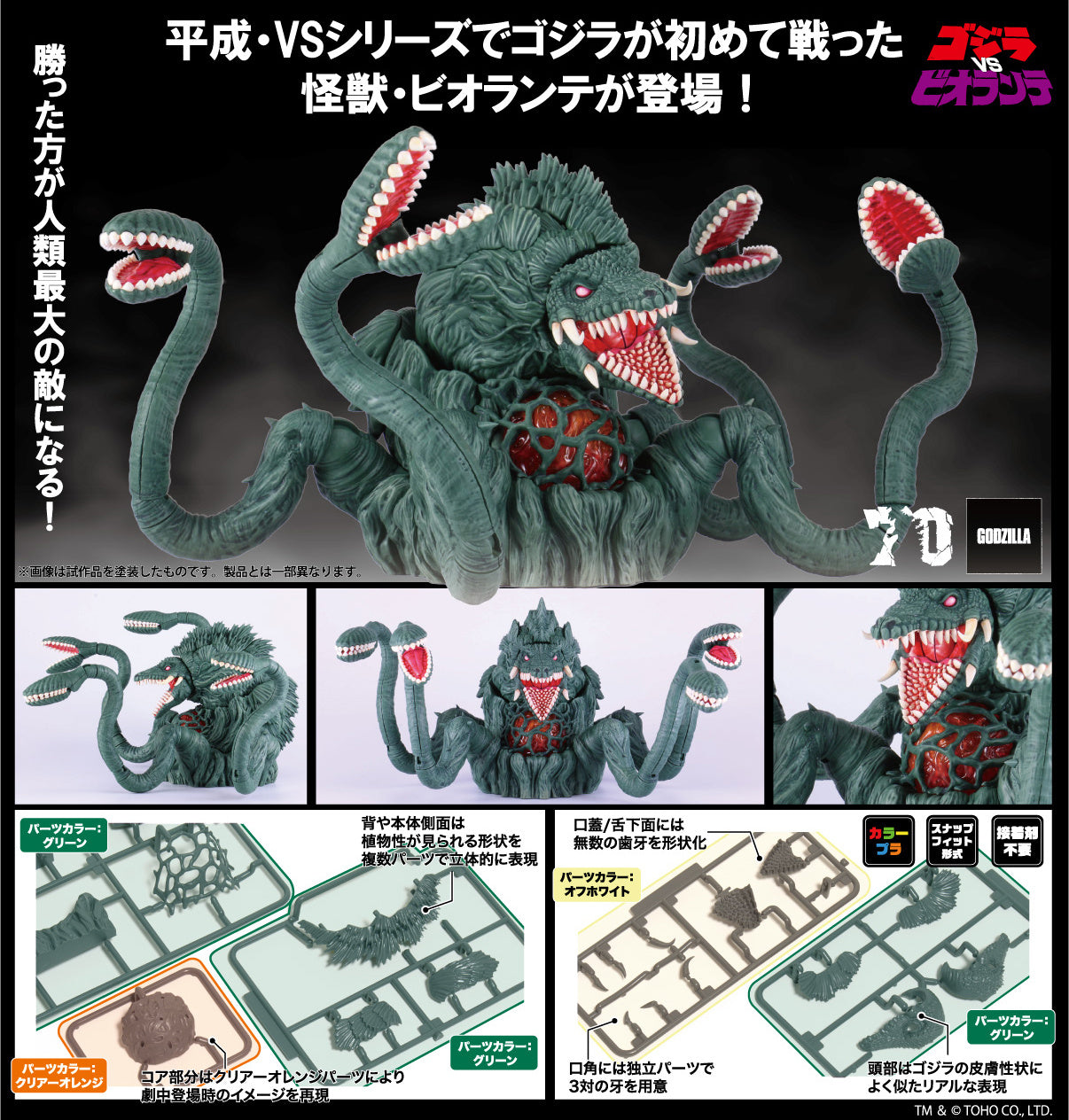 Fujimi brings us a brand-new "Chibi Maru" model kit of Biollante, just in time to celebrate the 70th anniversary of "Godzilla"! Biollante appears in plant beast form and is made with a completely new mold. The kit snaps together so glue isn't needed; it's also made in color so painting is not necessary. With 28 runners and approximately 160 parts, this builds into a large-volume figure consisting of the main body and four pairs of tentacles. The head is realistically expressed, and the core part is made of clear orange parts to reflect Biollante's appearance in the film. The main body has two movable parts, and the tentacles have three movable parts for a high degree of freedom in posing! Three pairs of fangs are provided as independent parts for the corners of the mouth; the lower jaw can be moved and opened, and countless teeth are molded onto the palate and underside of the tongue. Multiple parts allow you to realistically recreate the back and sides of the main body's plant-like shape; the lower jaws of the tentacles can be moved, and you can pose them with their jaws open! Special stickers are included to express the color of the details, too.