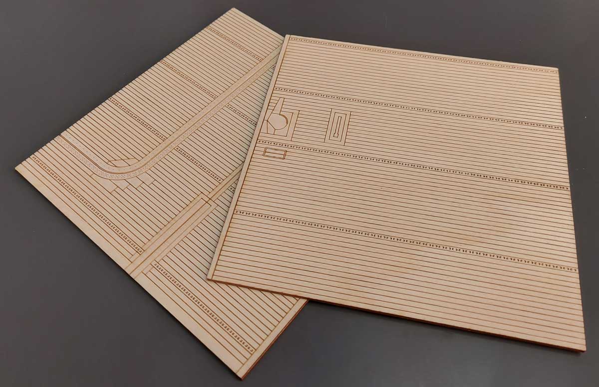 Two laser engraved plywood flight deck sections from ""Casablanca"" class escort carrier14.5 x 14.5 cm