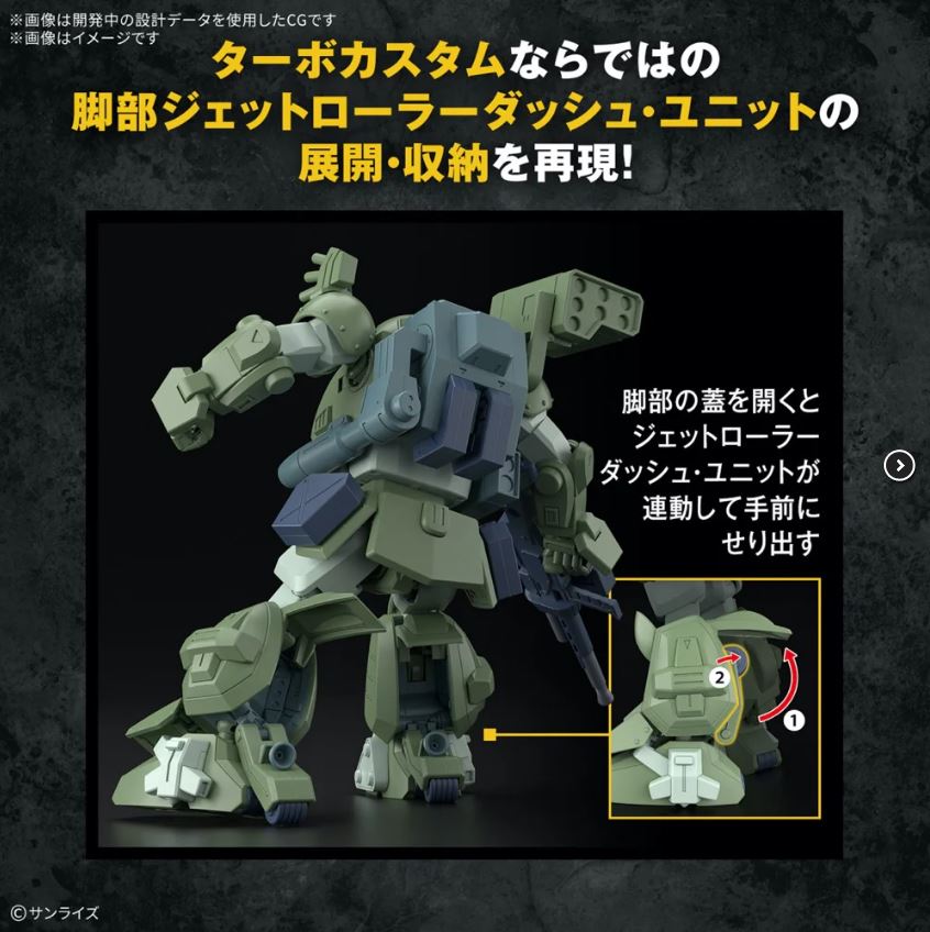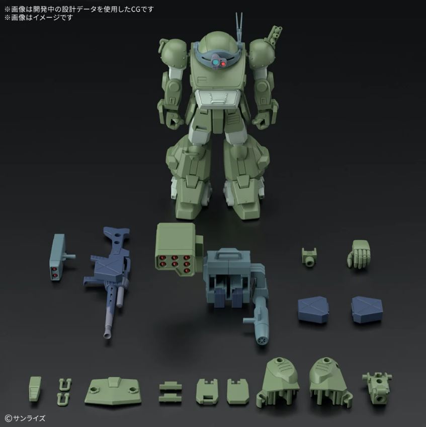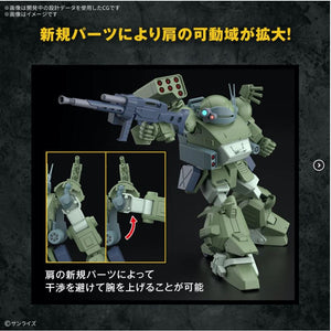 Bandai sure is getting the most out of this Scopedog mold! This version comes with the enhanced roller dash mechanism on the legs, which can be stored or deployed without part swapping, as well as the updated backpack with attached missile pod. There are also interchangeable exterior armor parts with adapters for different accessories, so you have a variety of display options upon completion!