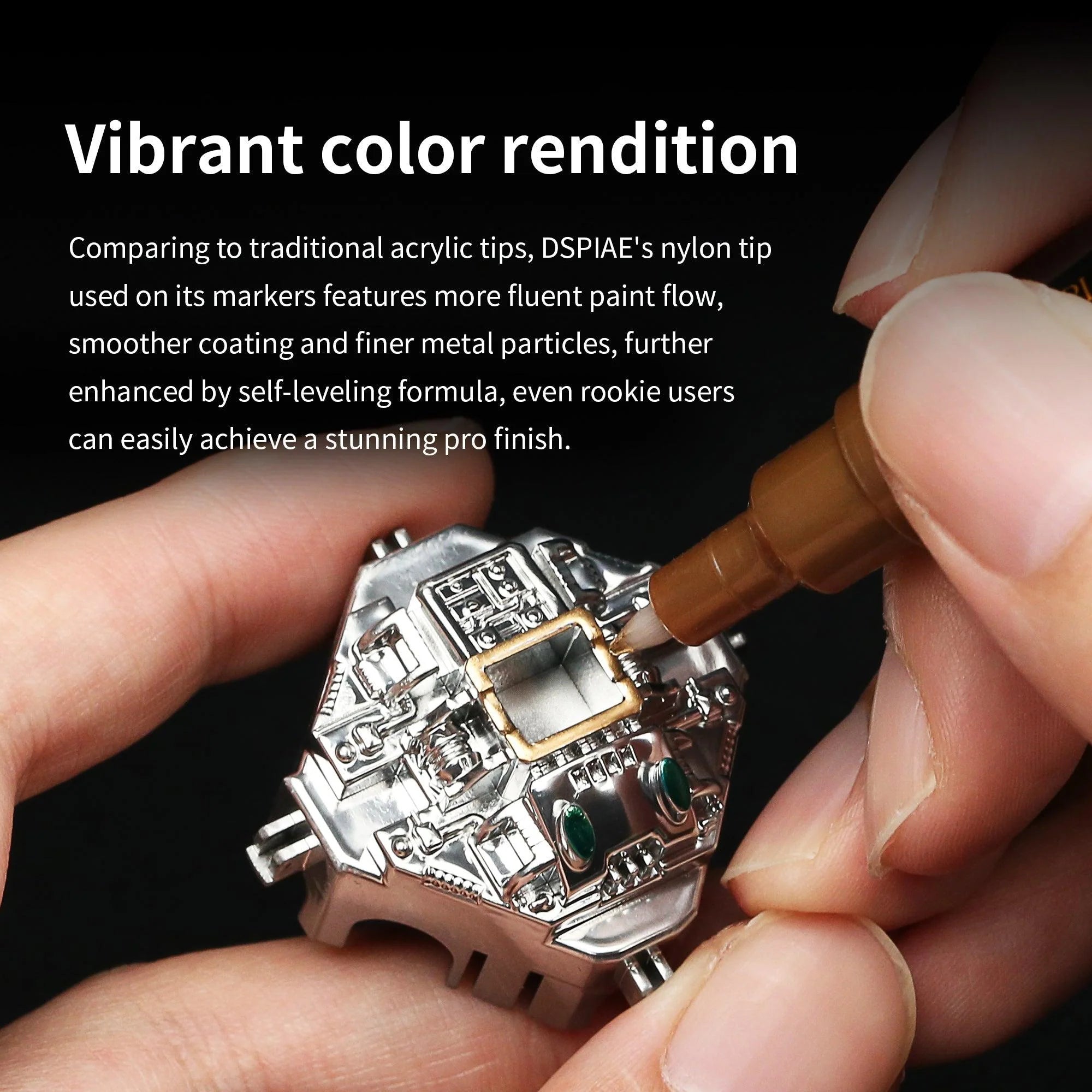 Comparing to traditional acrylic tips, DSPIAE's nylon tip used on its markers features more fluent paint flow, smoother coating and finer metal particles, further enhanced by self-leveling formula, even rookie users can easily achieve a stunning pro finish.