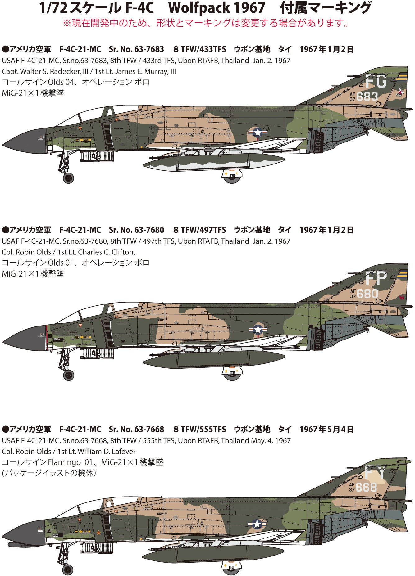 The 8th Tactical Combat Wing, commonly known as "Wolfpack," was deployed at the Ubon base in Thailand, which was the U.S. Air Force's front line base in Vietnam from December 1965, at the beginning of the Vietnam War. On January 2, 1967, Operation Boro was deployed to eliminate MiG fighters that posed a threat in the so-called "North Bomb," and seven new MiG21 fighters, which had just been paid by the Soviet Union from the fall of the previous year, were deployed for one day, but were shot down. The F-4C under the command of the Wolfpack shot down a total of 22 MiG fighters before switching to the D type.