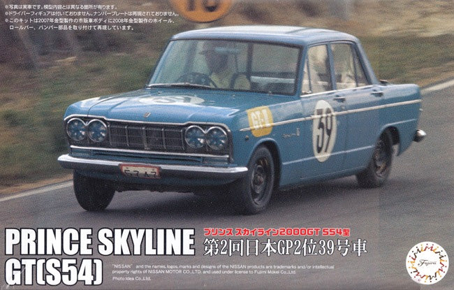 The second-place car from the second Japan Grand Prix, the Prince Skyline 2000 GTS54, now returns to Fujimi's "Inch-Up" model-kit lineup! The cockpit roll bar is included for a Spartan racing environment; the front axle has a structure that allows steering. The lights and glass are made with clear parts, and decals are included to reproduce various logos and bib numbers.