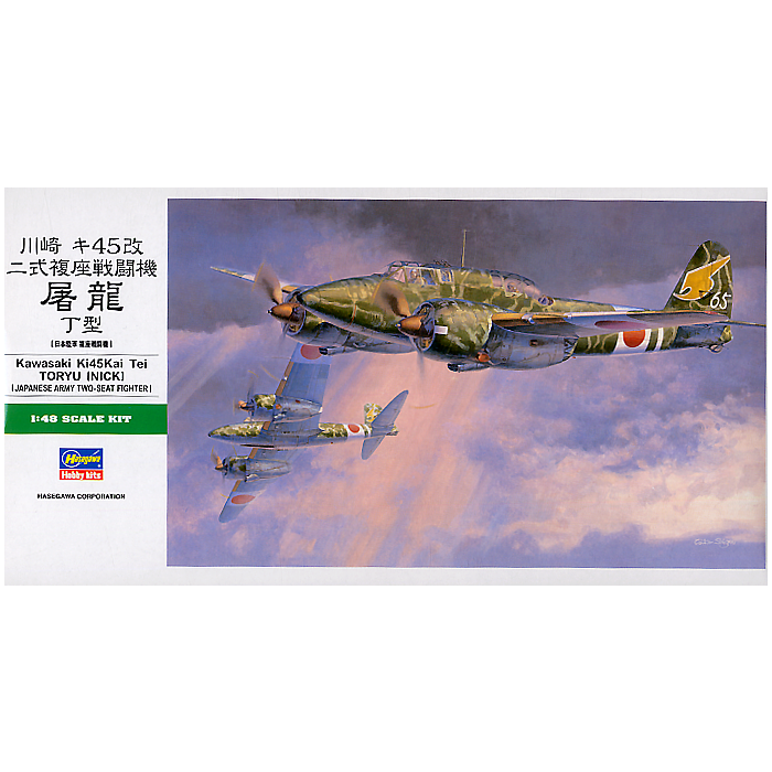 Reissue of the Hasegawa 1/48-scale Ki-45 kit with decals and new parts to build it as a Ki-45 Kai Toryu Type Tei. Includes new long nose, cowlings, slant-mounted gun, and upper fuselage parts. Markings are for the mottled "65" and all-green "59" of the 53rd Flight Regiment, 3rd F.G. at Matsudo A.B. in February 1945, plus the all-green "Hitachi" of the 5th Flight Regiment at Kiyosu A.B. in 1944-45. See box art for marking details.
