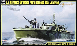 US Navy Elco 80’ Motor Torpedo Boat, Late Type is a continuation of Elco’s PT-103 design with improved firepower. Length remained at 80ft (24.2M) , beam 20ft 8in. (7M), and displacement of 56 tons. Her 3 sets of 1,350 horse power Packard 4M-2500 V12 gasoline engines enable top speed of 43 knots. The up gun late type was a direct respond to increased activities of Japanese armed landing craft and transport in the Pacific islands. Early torpedo launch tubes were replaced by lighter roll off type Mk 13 Torpedoes. Additional firepower consists array of 20mm Mk4, 37mm T9 automatic cannon, 40mm Bofers, Mk50 5in. 8 tubes rocket launcher and whatever the crew can get their hands on.