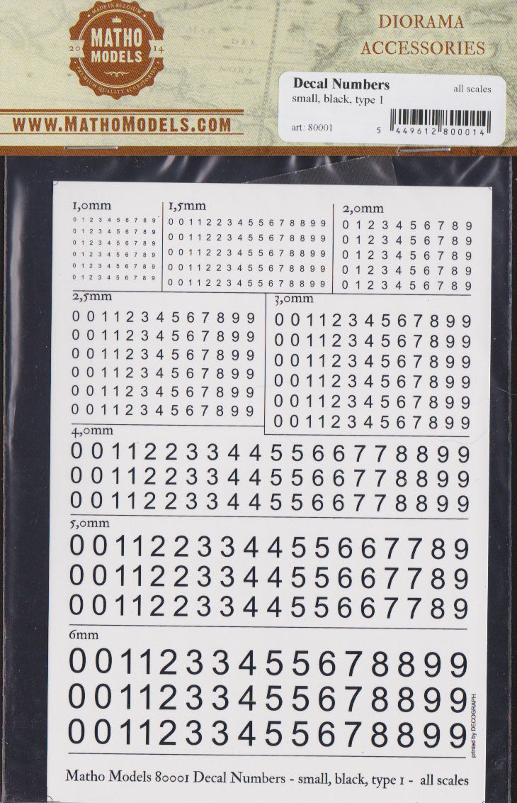 Contains 1 A6 sized sheet with various water slide decals. This sheet contains small black digits, available in different heights. The height is listed on the sheet, so it is easy to choose the right height for your needs.