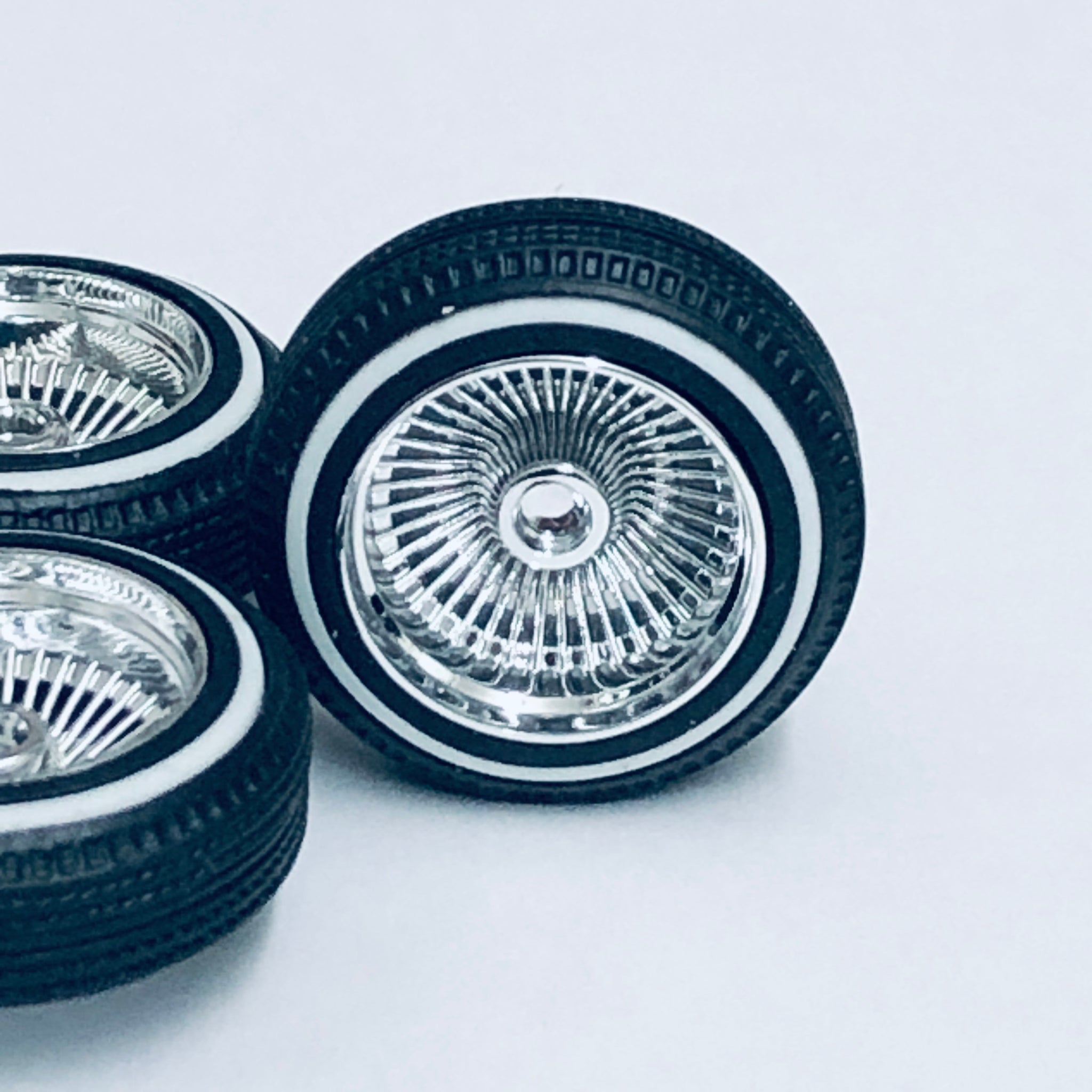 Complete set of 1/24 scale rims / tiresAccepts 0.081" (2.06 mm) axles with chrome knockoffs , Dayton