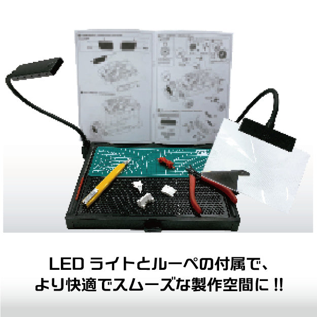 Racing Miku is ready to make your model workplace as cute as possible! This highly useful workstation is handy for basic work, such as cutting parts and assembly; it features a detachable text stand, and a nipper holder for the left hand is included too. It features an LED light and magnifying glass with the Racing Miku logo design and team motif. Order yours today!