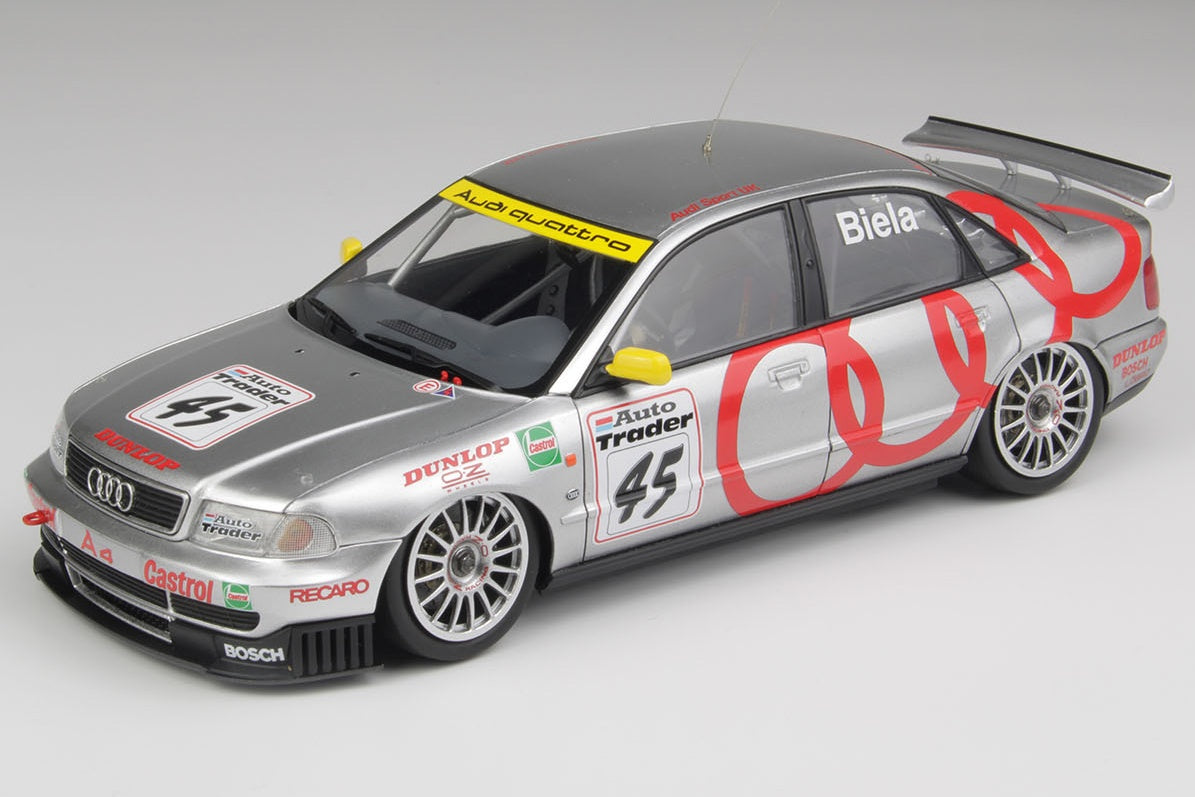This model kit from NuNu is a completely new mold! From the form of its body to the details of the underside of the chassis that reproduces the four-wheel drive mechanism, and even the cockpit that's unique to the competition model, this kit reproduces the vehicle accurately while keeping ease of assembly in mind. The rear wing and details of the front spoiler are finished with fine reproduction of the details; the cockpit includes the roll bar and in-vehicle equipment. Decals are included for Audi Sports UK's machine, car no. 45 driven by Frank Viera, and John Vintcliff's car no. 44, who won the series championship in the 1996 season. Order yours today!