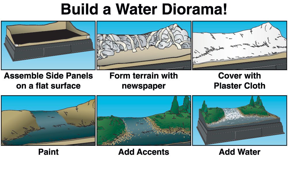 Create any type water area for your diorama. Kit includes everything needed to make waterfalls, ponds, rivers, rapids, oceans, waves, and more! Ages 7 and up.