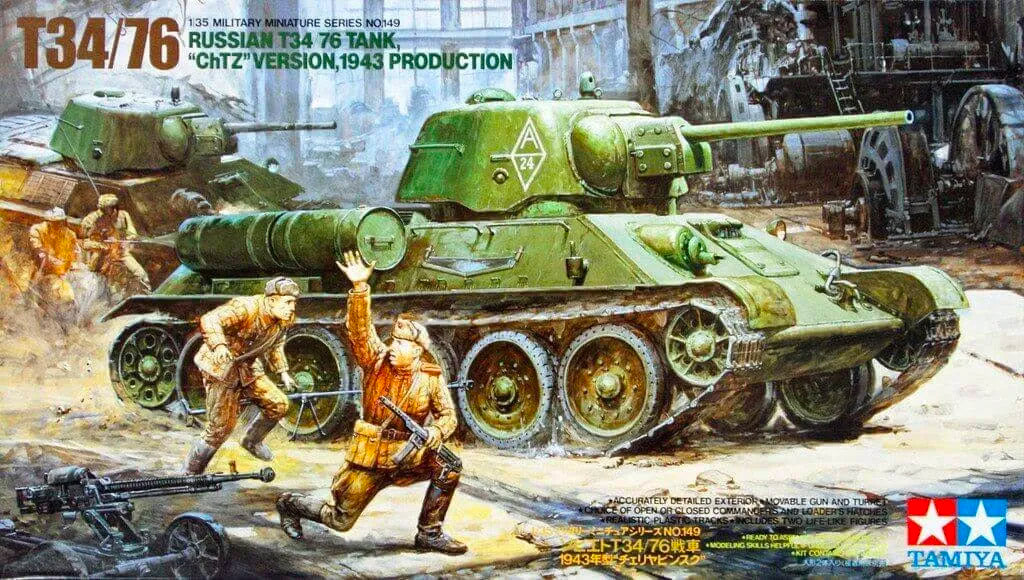 During the early period of the Second World War, the Wehrmacht invasion into industrialized Russia threatened the supply of critical war materials and manufacturing plants. Russia's National Defense Committee made a decision to move tank production and associated factories. The location became known as "Tankograd" (Tank City) a nickname acquired for this site situated deep in the Urals. The Russians, with an urgent requirement to reinforce their tank strength, made efforts to simplify tank manufacturing methods. This resulted in many versions of the T34 tank, that differed greatly from each other. One of the more distinctive versions was produced at the Chelyabinsk Tractor Works, "ChTZ" in Tankograd in 1943. This model used a one piece cast turret with pronounced rounding on the edges of the turret roof and a peculiar dip along the lower edge of the turret. This improved turret, had additional periscope and pistol ports, and provided more room and comfort for the crew. A new five-speed transmission with modified clutch was added, replacing four-speed model. Combined with engine improvements, these modifications extended the time between maintenance and repair. With few of the "ChTZ" versions produced, of the thousands of T34/76 tanks manufactured, it is regarded almost as a rarity.