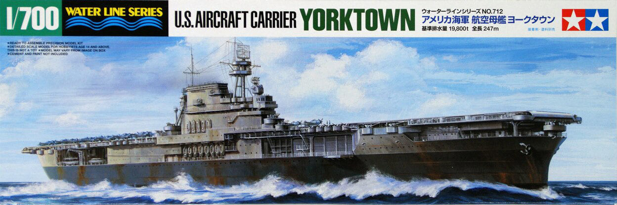 The USS Yorktown was completed in September 1937 as the first ship of her namesake-class and the U.S. Navy's sixth aircraft carrier. When the Pacific War broke out, she became the flagship of Task Force 17 under the command of Rear Admiral Frank J. Fletcher and conducted a number of operations around the Pacific. During the Battle of the Coral Sea in May 1942, she helped thwart the Japanese Navy's advance on New Guinea despite suffering severe damage. Subsequently, at the Battle of Midway, the Yorktown and her sister ships USS Enterprise and USS Hornet defeated the Japanese Mobile Fleet, but the Yorktown herself suffered severe damage by torpedo and bomb hits from the aircraft of the Japanese carrier Hiryu. She was finally sunk by torpedoes from the Japanese submarine I-168. The Tamiya 1/700 scale model is a precise replica assembly kit of this iconic carrier during WWII.