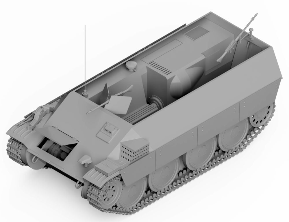 This kit contains a model of BMM Katzchen APC design based on 38 T chassis developed in 1944. Two prototypes with Praga Wilson gear box were made, one powered with Tatra 103 diesel engine and the other with Tatra NR engine.