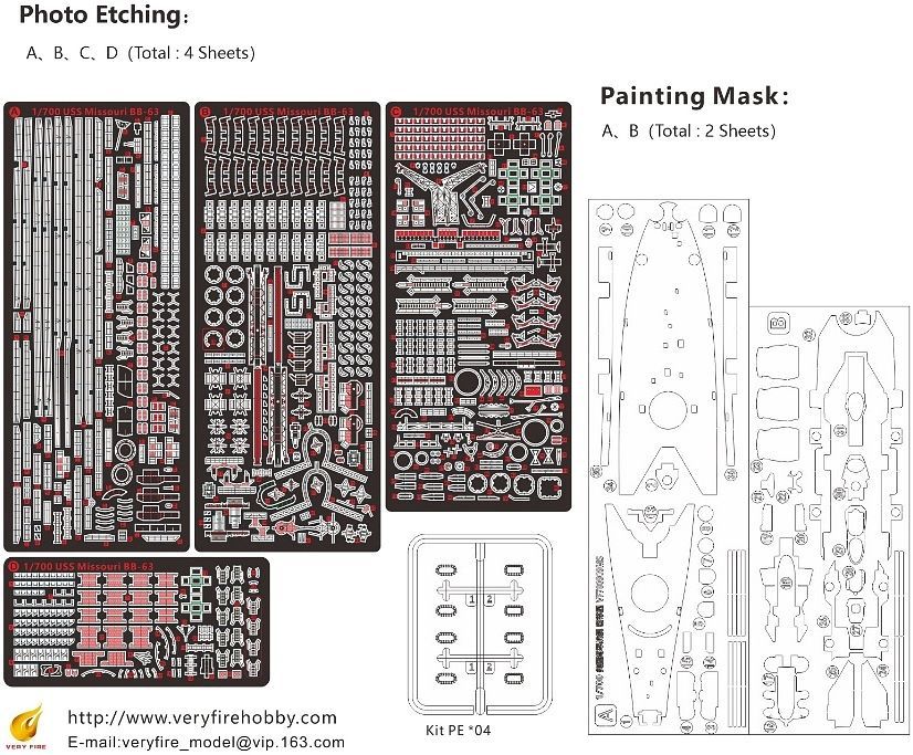 This kit from VeryFire is a completely new mold! The U.S. Navy battleship Missouri is the third Iowa-class battleship, and is named after the 24th state of the United States; she is the fourth ship to bear the name. Launched in 1944, the Missouri was the 63rd battleship built by the U.S. Navy; she participated in the Battle of Okinawa during World War II, and on September 2, 1945, the Japanese Instrument of Surrender was signed on her deck. She retired in 1955 after the Korean War; in 1986, she added state-of-the-art weapons and electronic devices such as the BGM-109 Tomahawk, Harpoon, and Phalanx CIWS and was put back into service. She took part in the Gulf War in 1991, and in 1992 was retired again; she has been preserved as a memorial ship in Pearl Harbor, Hawaii since 1999.